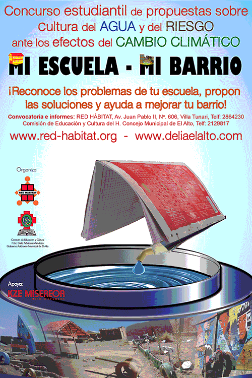 Red Hábitat y la Comisión de Educación del honorable concejo municipal de El Alto organizan el primer concurso de proyectos sobre la cultura del agua y del riesgo ante efectos del cambio climático: “MI CIUDAD, MI BARRIO”. El concurso está dirigido a los estudiantes de 3° a 5° de secundaria en representación de su colegio. Se trata de lograr que los estudiantes de colegio analicen la situación del agua en su unidad educativa y propongan soluciones viables, comprometiéndose a participar activamente en la ejecución de estas.