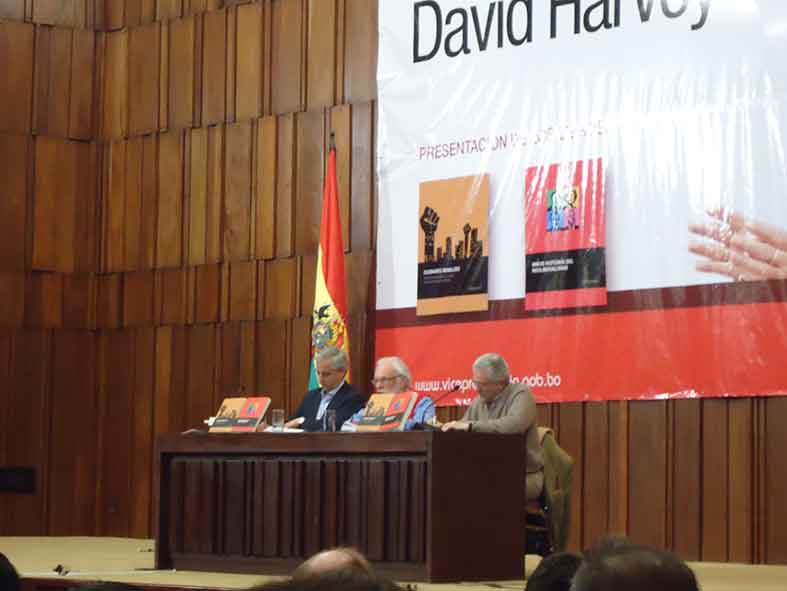 Con el patrocinio de la vicepresidencia del Estado Plurinacional de Bolivia, el martes 19 de agosto, en el Auditorio del Banco Central de Bolivia se realizó la conferencia de David Harvey: “Espacios Críticos Frente al Nuevo Liberalismo” acompañado en calidad de comentaristas por el argentino Julio Gambina de la Clacso y Alvaro García Linera, Vicepresidente de Bolivia. Asistieron a la conferencia alrededor de 1300 personas pertenecientes a diversas organizaciones sociales, académicas e institucionales.