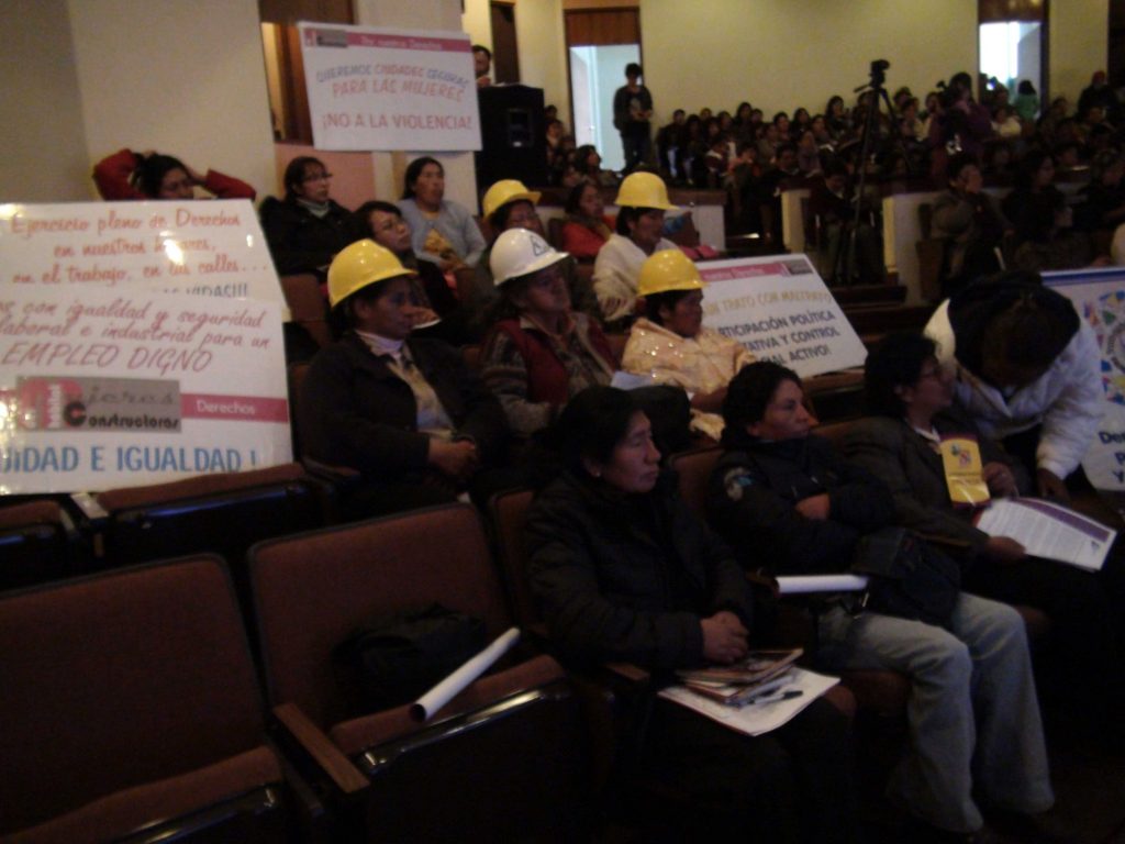 Armadas con baldes, palos, brochas y rodillos y con el lema “Por Nuestros Derechos, Ni Más Ni Menos”, el grupo de mujeres constructoras del hábitat participó del foro político: “De Frente a las Mujeres”, organizado por la Red Boliviana de Mujeres Transformando la Economía (REMTE), donde destacaron por su participación al interesarse por el futuro laboral, tanto de hombres como de mujeres, del rubro de la construcción, demandando seguridad industrial, social y laboral para lograr su derecho a un trabajo digno y sin discriminación.