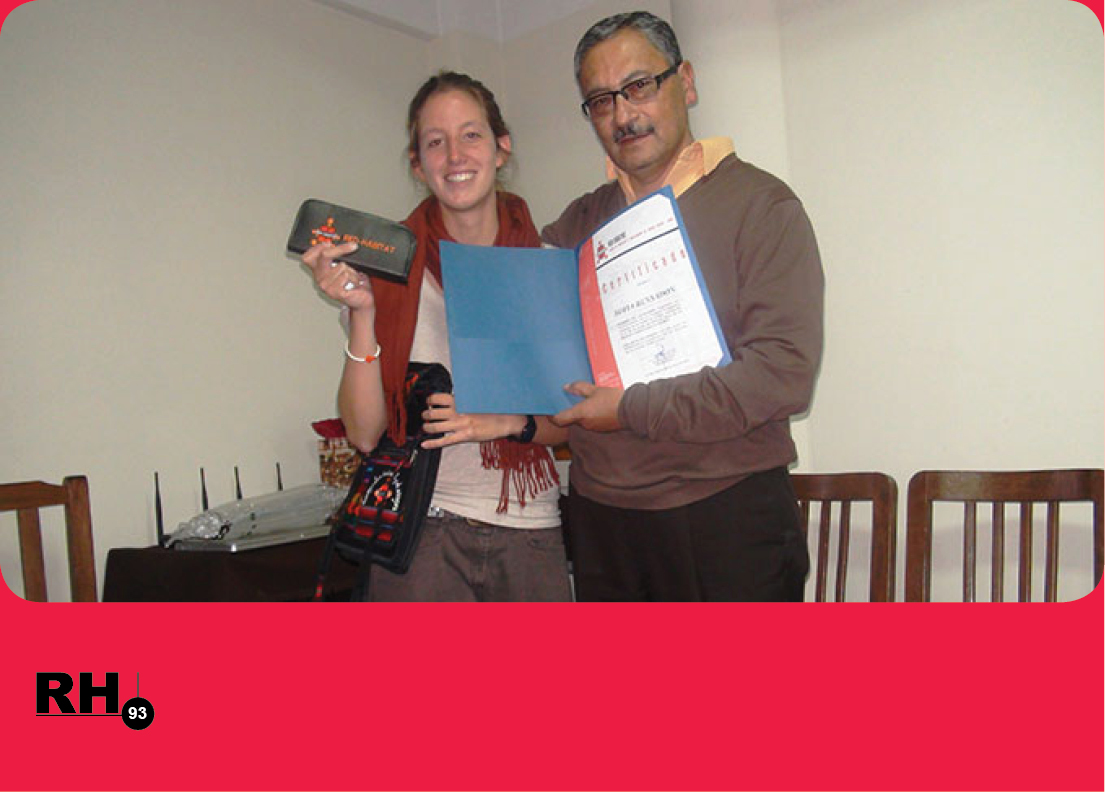 En representación de las mujeres constructoras, María del Carmen Cáceres, Secretaria General de la ASOMUC, le agradeció por venir desde lejos y dedicar parte de su tiempo, energía, capacidad y compromiso por sus derechos. “Por haber retratado nuestras realidades como mujeres que se dedican a la construcción, como opción laboral, para mejorar nuestras condiciones de vida y la de nuestras familias”, dijo a tiempo de desearle éxitos en su carrera profesional. El Director Ejecutivo de Red Hábitat, David Quezada entregó un certificado de reconocimiento a Sofia Bensadon, resaltando su sensibilidad y compromiso demostrado en sus funciones.
